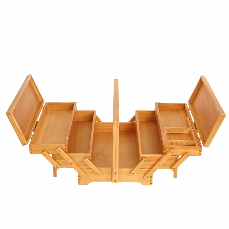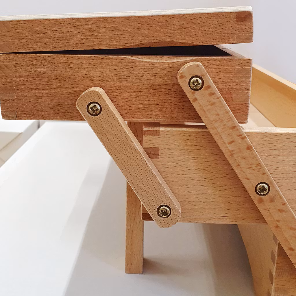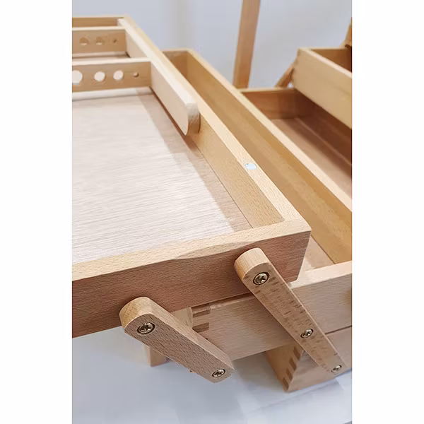 Stabil och funktionell konstnärslåda/multifunktionslåda med många förvaringsmöjligheter. En mycket vacker verktygslåda designad för konstnären. Lådan har flera praktiska funktioner, såsom ett fasat jack i locket som gör det enkelt att fälla upp det, samt ben för ökad stabilitet som fälls ut när lådan öppnas. Totalt sitter det åtta magneter i de två locken för att hålla lådan stängd och förhindra att den öppnas under transport. På varje sida av lådan finns två handtag som underlättar öppning och fungerar som skydd mot repor. Alla komponenter i konstnärslådan är sammanfogade med lim och så kallad öppen rak sinkning, vilket garanterar extrem stabilitet och hållbarhet. Handtaget är också stabilt och välkonstruerat.