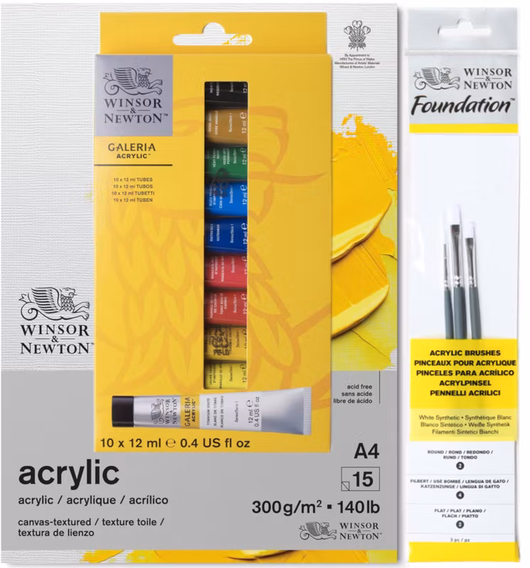 - Ett mycket prisvärt set med Akrylblock Galeria 300g A4 (3F) 15ark Syntetpenselset W&N Foundation Akryl No. 3 (6F) Akrylfärgset Galeria 10x12ml