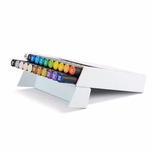 CHAMELEON 22-PACK DELUXE SET Komplett set med 20 markers samt blender, detaljpenna och extra spetsar som är förvarade i en box.